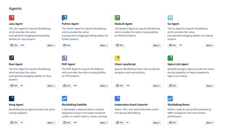 skywalking其实用的比较少,但其实目前持续更新下,功能还是蛮强大的,目前支持的agent也是蛮多的,如下是一些常规的支持agent,如果在选择链路监控的话,可以看下这款。