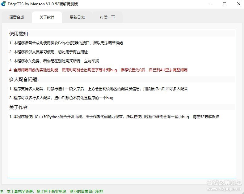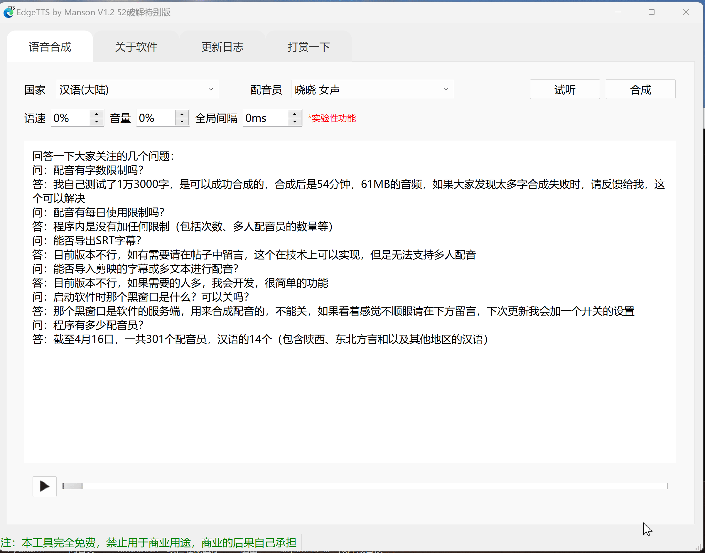 免费且无限制: Edge-TTS是完全免费的,没有使用次数限制。用户可以随意使用,不用担心会被收费。