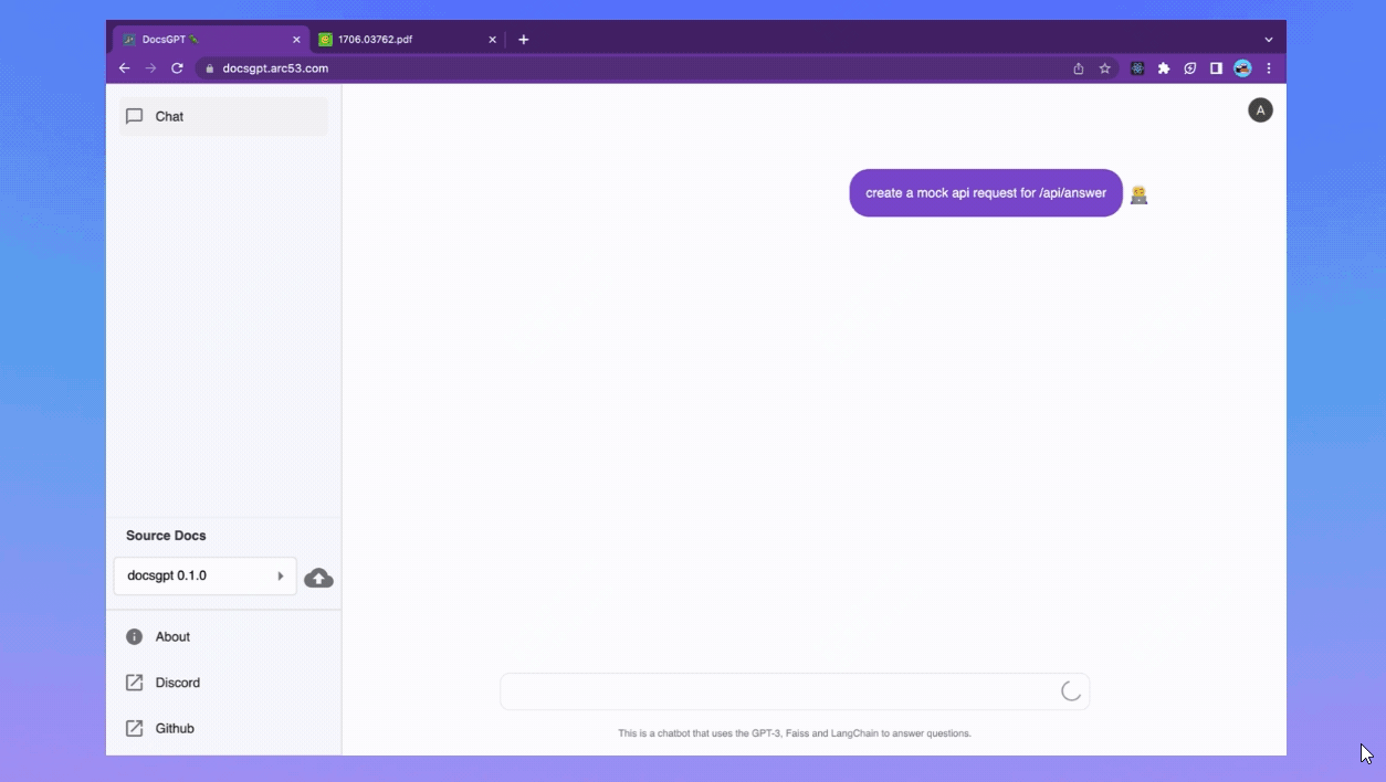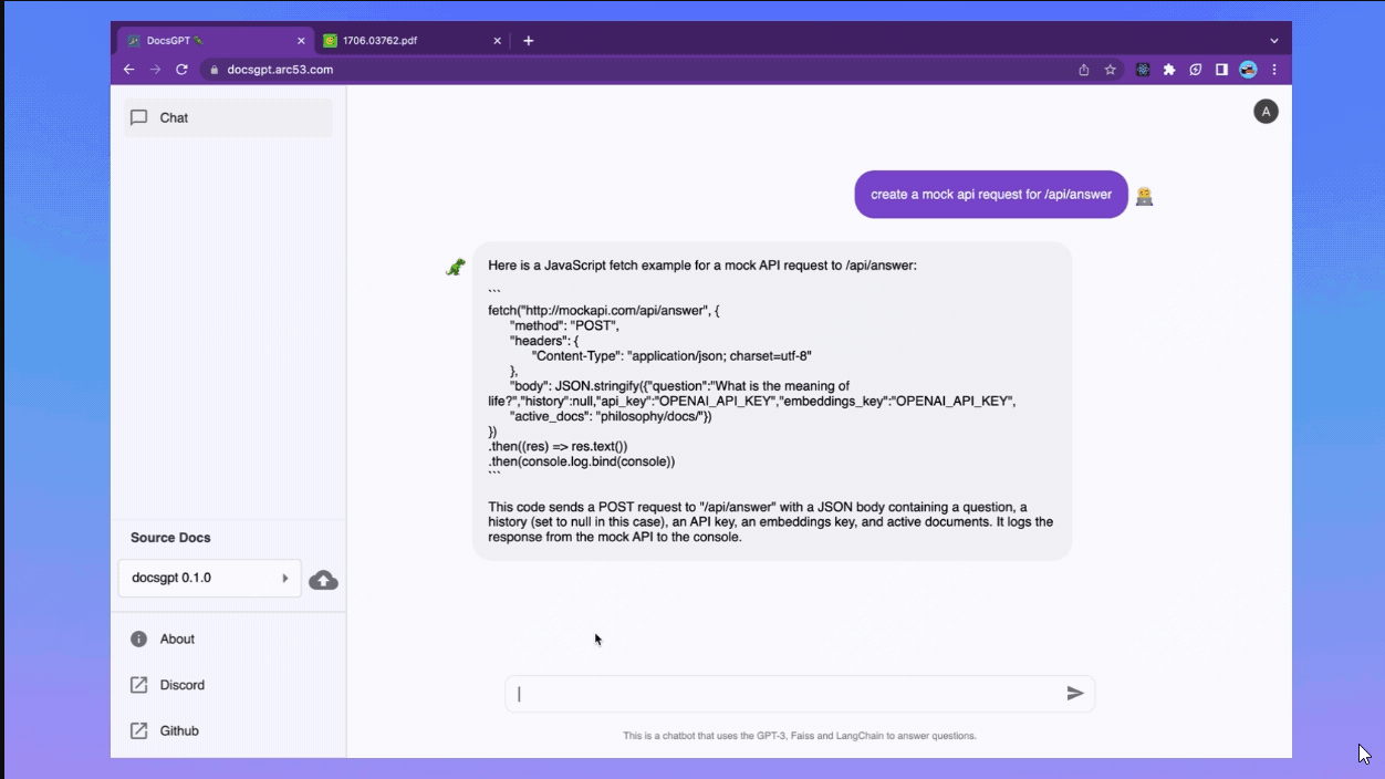 为了解决这个问题,我们推出了DocsGPT,一个基于GPT模型的项目文档智能查询解决方案。DocsGPT是一个开源的项目,它利用了GPT模型强大的自然语言理解和生成能力,为开发者提供了一个简单而高效的文档查询接口。开发者只需要输入自然语言的问题,就可以从项目文档中获得准确和相关的答案。
