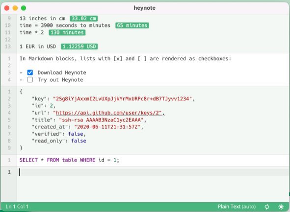 Heynote 的主要特点是简洁和高效,它不会给您带来任何多余的功能或干扰,只是提供一个纯粹的文本编辑器,让您可以随时随地地写下您的想法和代码。Heynote 还具有以下一些特点: