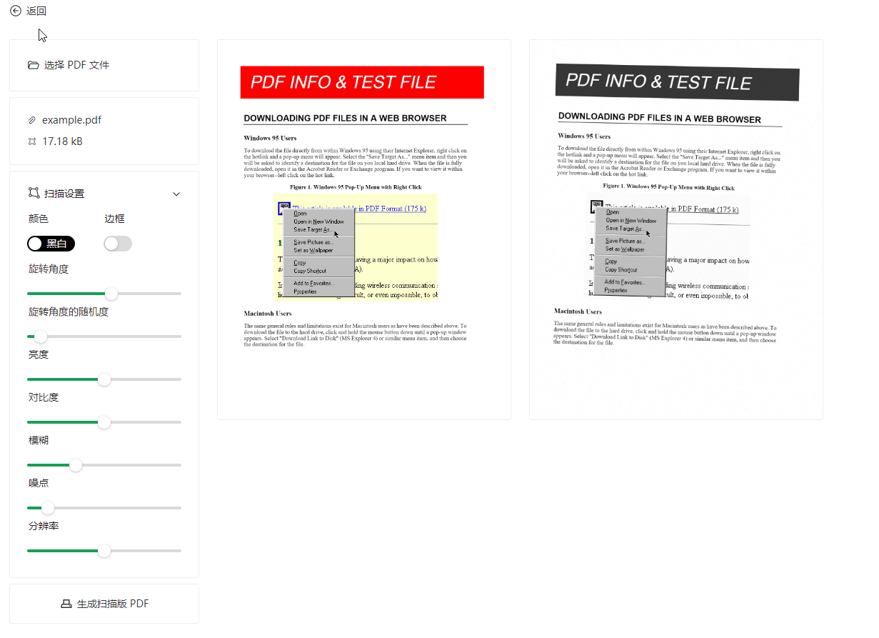 - 等待一会儿,你就可以在右边看到转换后的 PDF 文件,它看起来就像是扫描件一样。