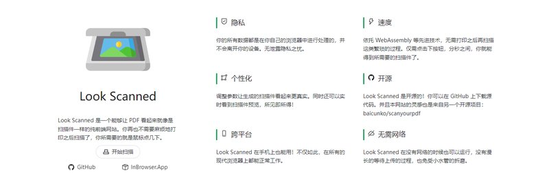 答案是有的,那就是 Look Scanned,一个能够让 PDF 看起来像扫描件的纯前端网站。