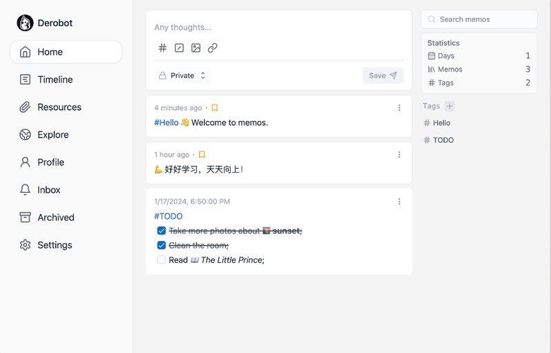 - 笔记扩展:您可以使用 Memos 的 API,与其他的应用或服务进行集成。您还可以使用 Memos 的插件,为您的笔记添加更多的功能和效果。