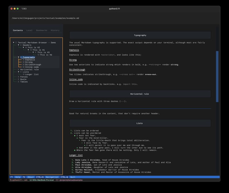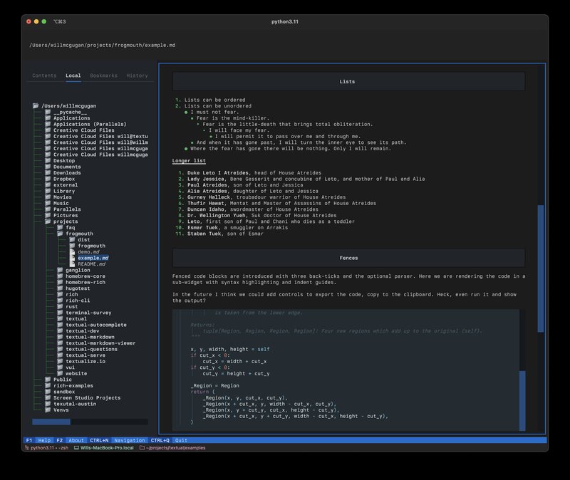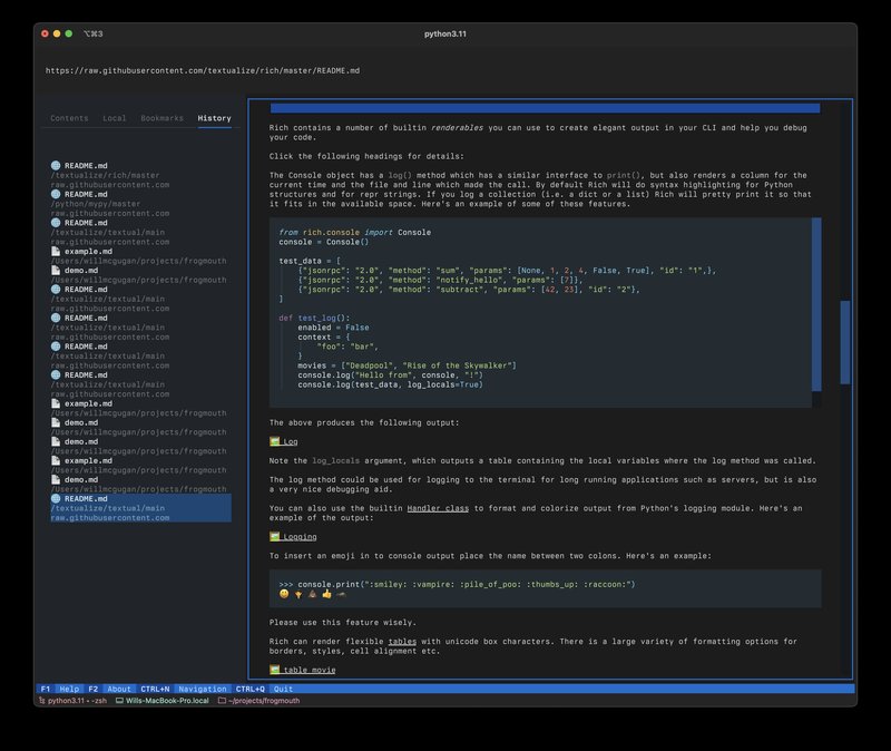 Frogmouth 是一个为终端构建的 Markdown 浏览器,它是由 Textual 框架开发的。