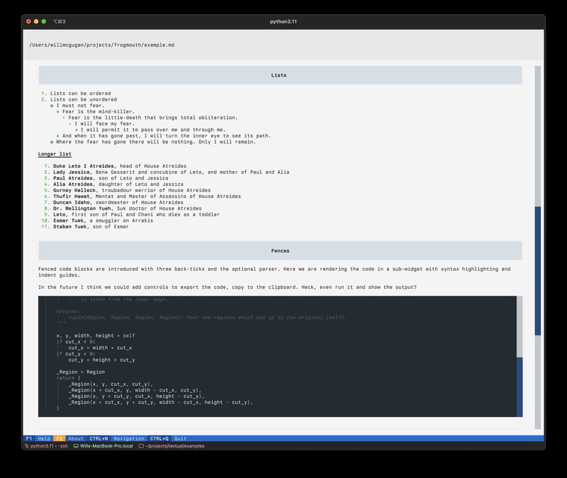 Frogmouth 的这些特点使其成为一个强大且易于使用的工具,适合那些希望在终端环境中查看和浏览 Markdown 文件的用户。