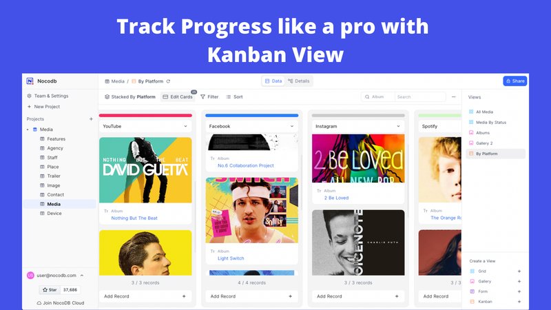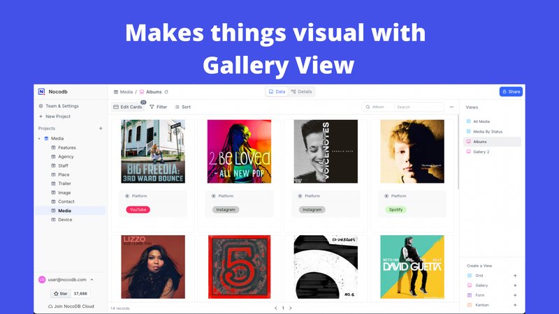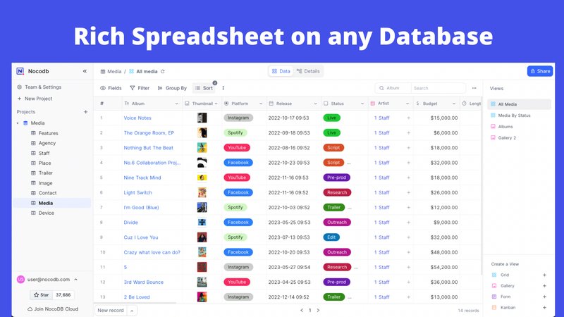NocoDB 是一款开源的 Airtable 替代品,可以帮助您轻松构建数据库应用。它提供了一个直观的用户界面,可让您创建表、视图、表单和关系,而无需编写任何代码。