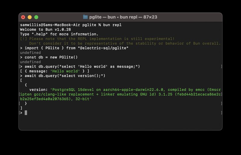 const db = new PGlite(); await db.query("select 'Hello world' as message;"); // 返回结果: { rows: [ { message: "Hello world" } ] } -