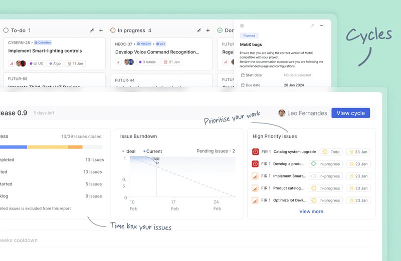 周期管理:通过周期功能保持团队的工作节奏,使用燃尽图等工具获取项目进展的洞察。