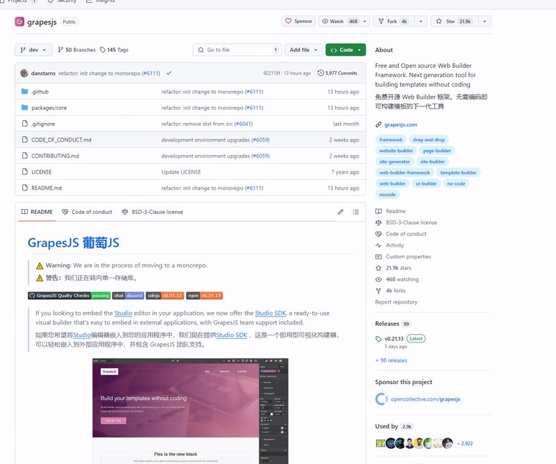 GrapesJS 是一个开源的网页构建框架,旨在帮助用户无需编写代码即可轻松创建 HTML 模板。它不仅适用于网页,还可以用于创建新闻通讯、移动应用程序等。GrapesJS 主要设计用于内容管理系统(CMS)中,以加速动态模板的创建。