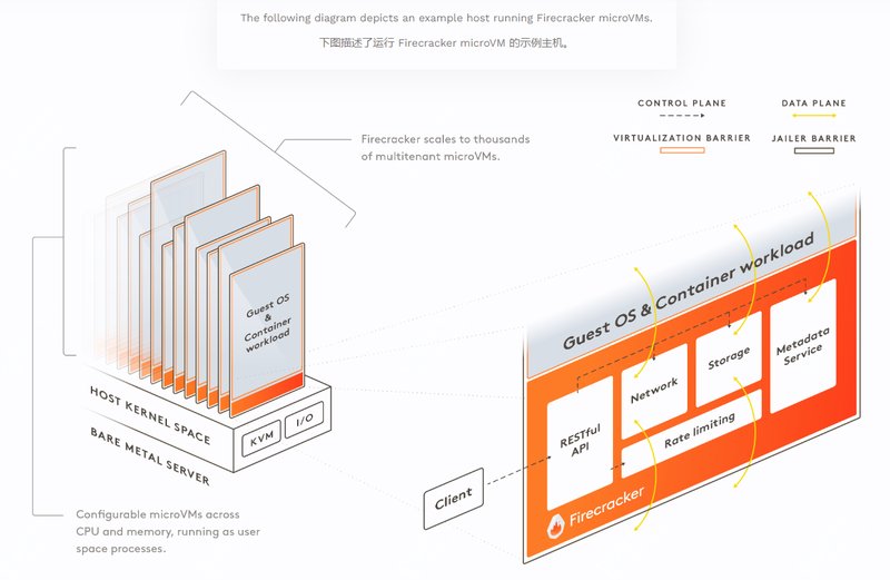 与容器集成良好: 虽然 Firecracker 是一个虚拟机管理器,但它与容器化技术有很好的兼容性。与传统虚拟机相比,Firecracker 更接近容器化应用的性能,同时提供了更好的安全隔离。通过与 Docker 或 Kubernetes 集成,用户可以在享受虚拟机隔离性的同时,获得与容器类似的灵活性。