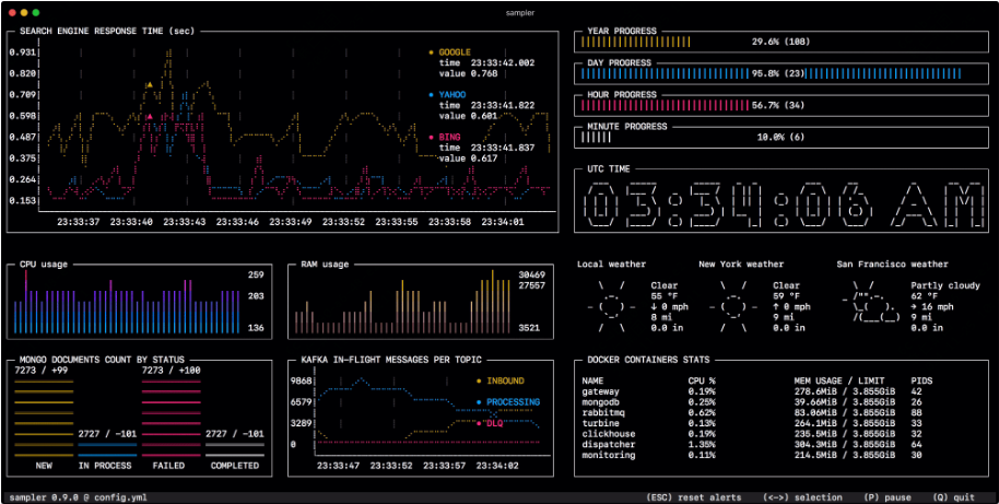 Sampler 是一个高度可定制的命令行实时仪表盘,用于监控和记录系统指标和应用程序运行状态。它由 GitHub 用户 sqshq 开发,旨在提供一个灵活而直观的监控界面,无需复杂的配置和繁重的资源开销。Sampler 支持自定义脚本和命令输出,让用户可以根据需求实时监控各种数据。