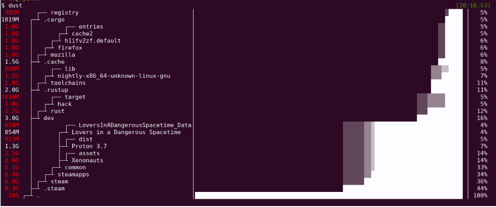 - 直观显示:Dust 使用颜色和条形图来表示目录和文件的大小,使用户一目了然。