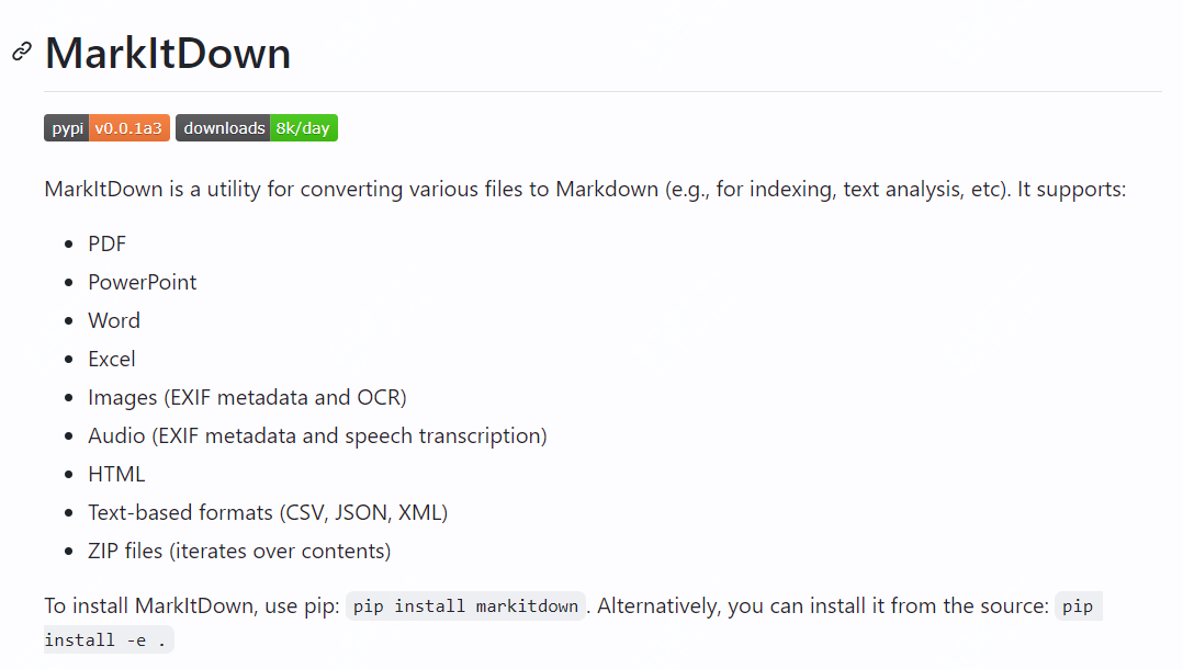 MarkItDown 的设计初衷是为了提高内容处理的效率和灵活性。通过将多种文件格式转换为 Markdown,用户可以更方便地进行文本索引、分析和处理。这对于开发者、研究人员以及需要处理大量文档的用户来说,无疑是一个强大的工具。