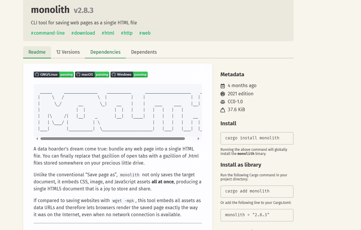 cargo install monolith - 使用 Homebrew 安装(macOS 和 GNU/Linux):