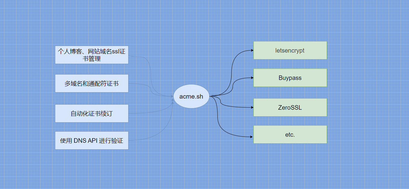 而acme.sh就是一个开源的acme协议的客户端,用于从 Let’s Encrypt 和其他 ACME 兼容的证书颁发机构获取免费的 SSL/TLS 证书。它完全用 Unix shell 脚本编写。