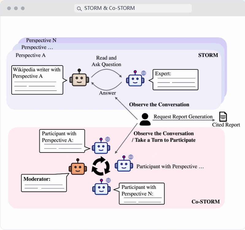 STORM(Synthesis of Topic Outlines through Retrieval and Multi-perspective Question Asking)是一个由大型语言模型驱动的知识管理系统,能够基于互联网搜索撰写维基百科风格的文章。它不仅可以自动生成带有引用的长篇文章,还引入了人机协作模式(Co-STORM),进一步增强了信息搜集和知识整理的功能。