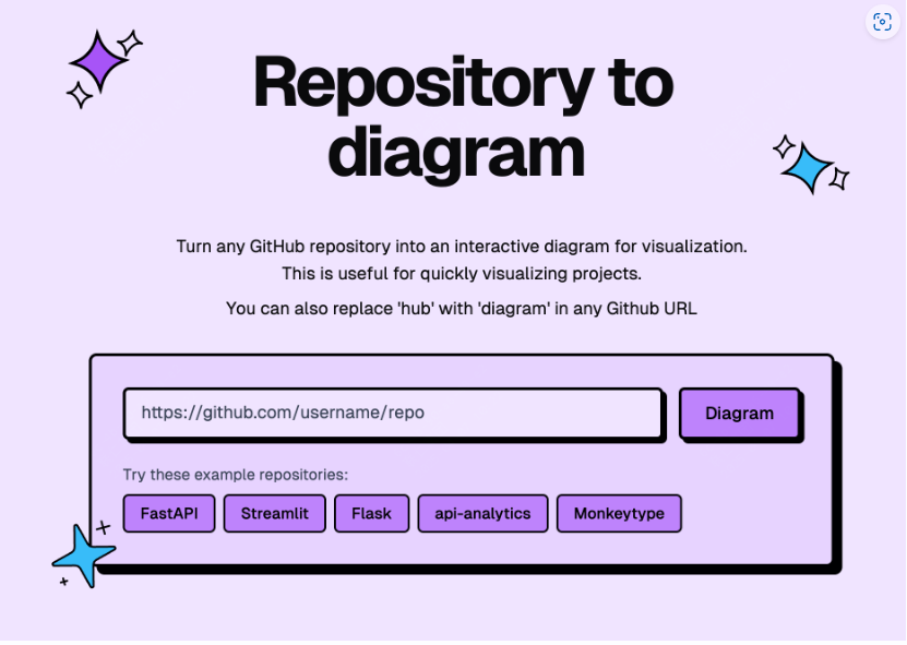 - 即时可视化:将任意 GitHub 仓库的结构转换成系统设计或架构图,秒级生成。