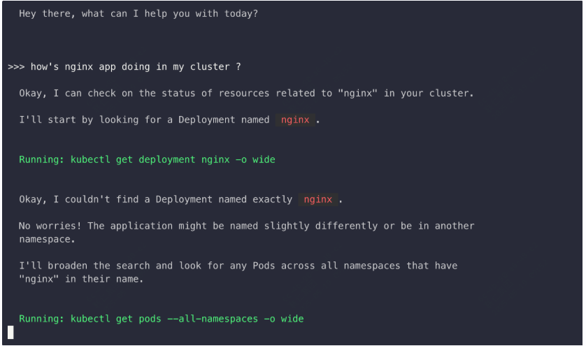 kubectl-ai 通过 AI 模型理解用户输入的自然语言,并自动转换为 Kubernetes 相关的命令。例如,你可以直接输入“检查 hello 命名空间中的 nginx 应用日志”,kubectl-ai 便会自动生成适当的 kubectl 指令并执行。