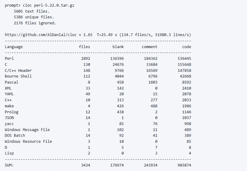 cloc 采用 Perl 编写,无需额外依赖,可在 Linux、macOS、Windows 等多个操作系统上运行,甚至支持 Docker 环境。 -