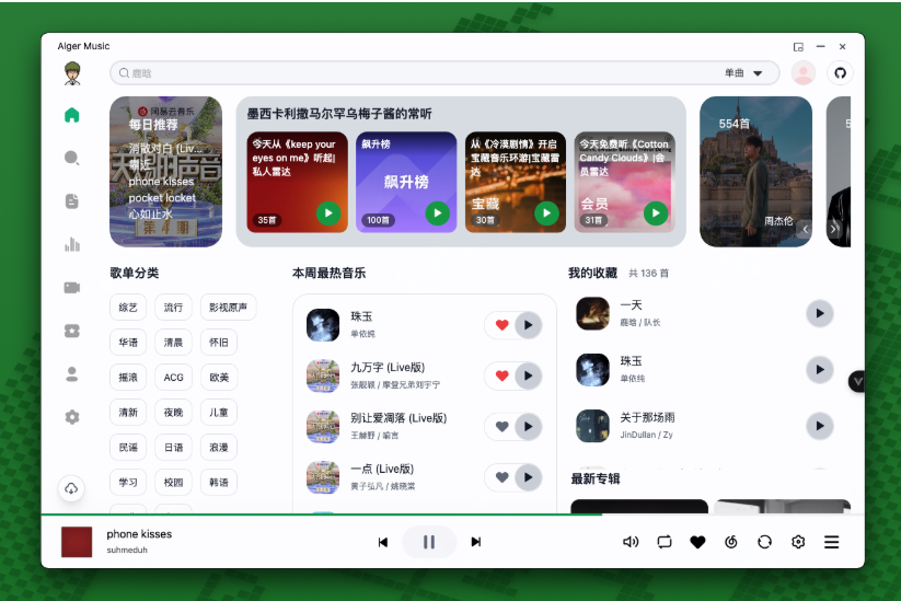Alger Music Player 是一款集本地服务、桌面歌词、音乐下载、远程控制于一体的音乐播放器,专为追求高品质音乐体验的用户设计。该播放器支持网易云音乐账号登录和同步,并提供全面的音乐推荐与播放管理功能,让用户能够更自由、更便捷地享受音乐。